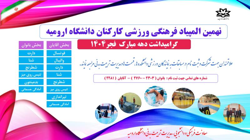 اطلاعیه ثبت نام در نهمین المپیاد فرهنگی ورزشی کارکنان دانشگاه ارومیه، گرامیداشت دهه مبارکه فجر 1404 اطلاعیه ثبت نام در نهمین المپیاد فرهنگی ورزشی کارکنان دانشگاه ارومیهگرامیداشت دهه مبارکه فجر 1404 Submitted by e.nasrollahpur on 12 بهمن - 1404